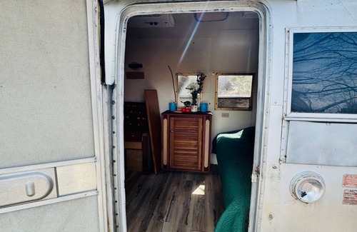 The Alice Camper is a bright space that can sleep up to 4 if you drop the bench seats. There is a beautiful view overlooking the pond. Green Acres Resort hosts vintage travel trailers refurbished to a comfortable standard of coziness. We feature a spring-fed swimming pond with golden sand beach, pickleball courts, fire pit and bbqs, and a custom bathhouse. Floyd Virginia is the heart of the countryside and the stars shine bright out here. We are excited to welcome you to Green Acres Resort!