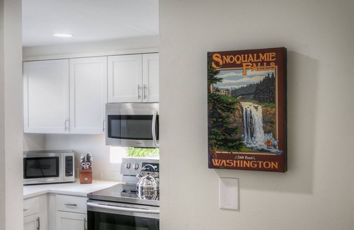 LocationMoon River Suites are located on Main Street in downtown North Bend. Out front is a great view of Mount Si and downtown is a short few blocks walk. Out back, enter another world with your private hot tub, barbecue on the banks of the South Fork Snoqualmie River. The building and grounds have been totally updated to present a modern getaway in a classic Pacific Northwest setting along the river next to a park. Beyond the park across the street is a beautiful wooded walk along the river which will eventually connect to the Snoqualmie Valley Trail should you choose to go that far. Easy access to all that North Bend has to offer: hiking, biking, Snoqualmie Valley Railway, Snoqualmie Casino, Dirt Fish Driving School, Compass Mountain Bike Tours, outlet mall, breweries, wineries, restaurants, Golf, Skiing, River Rafting, Fishing, movie theater, etc.The space Each suite is a two story town home with 1100 square feet of living space. You will have three suites for a total of 3300 sq ft. Each suite has 2 bedrooms, a full bath and balcony with river view upstairs. Downstairs is a fully equipped kitchen, dining and living area and half bath. Outside on the deck is your private hot tub and barbecue. All the furniture, appliances and supplies are brand new and selected for your comfort and enjoyment in modern style.