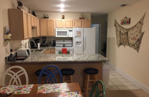 The 2nd bedroom has a brand new full over full bunk bed, completely redecorated in beautiful colors. It also has its own small, but private deck, overlooking the pool and boardwalk to the beach. The 2nd bath has a shower/tub combination. A nice size living room with a foldout queen sofa bed (for extra guests) services the main floor.