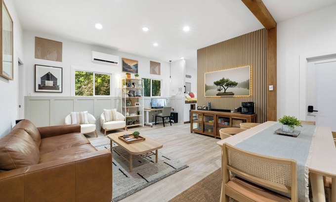Tucked beneath a towering coastal canopy on 14 private acres, The Barnhaus offers exclusive access to winding forest trails that lead to a secluded lakefront dock—perfect for morning coffee, quiet reflection, or casting a line. Step outside to your private deck, where a fire pit and picnic area overlook the woods and filtered lake views. Inside, premium finishes and natural textures create a warm, elevated space, while a dedicated workspace and discreet tech integration make it ideal for extended stays or creative retreats.