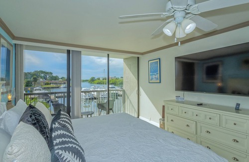 WATERFRONT room with BALCONY, BRAND-NEW Hotel Room-Condo at the Ramada Inn on 41. 2nd Floor, One large King bed with Two Twins, 65" TV, strong WIFI. ALL-NEW Interior, Vanity, Coffee/Tea bar w/ fridge and microwave. Heated Pool, Tiki Bar and Grill with daily meal and drink specials. Live music too! Beautiful Marina steps from your door...Bring your boat, rent one! Minutes drive to SRQ airport, USF, New College, IMG Academy, Downtown Sarasota, St. Armand's Circle & All area beaches!