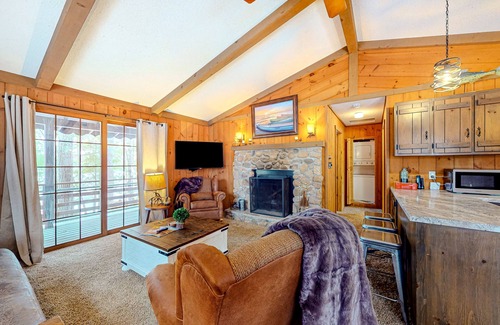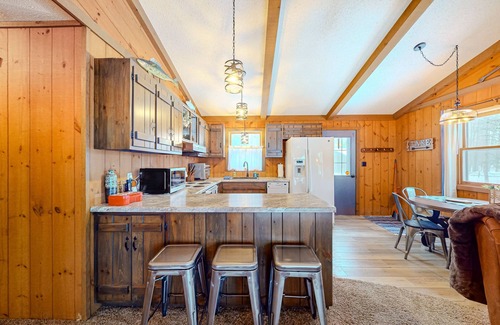 Under vaulted ceilings, the interior of Paddle Inn is a place of pure peace. The living room's wood-burning fireplace and smart TV make the perfect combination for evening movie viewings. Enjoy picturesque sunsets and an island view from the living room or on the covered lakeside platform with a swing. When you get hungry, the kitchen is fully updated with a full suite of appliances, a sizable breakfast bar, and an eat-in dining table. A gas grill is available outside if you'd prefer to cook alfresco.