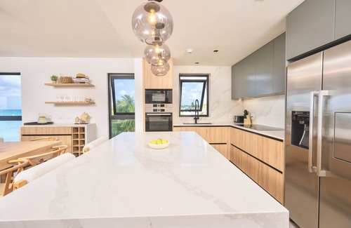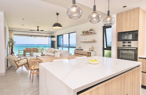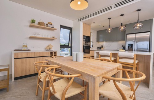 Imagine a spacious rooftop terrace with stunning 180 views of the Caribbean Sea, its waves sparkling under the sunlight. To the north of the rooftop there is a sleek, infinity-edge pool, with comfortable lounge chairs and lounge seating which offers a relaxing, luxurious atmosphere, perfect for lounging and enjoying the breathtaking sunsets.