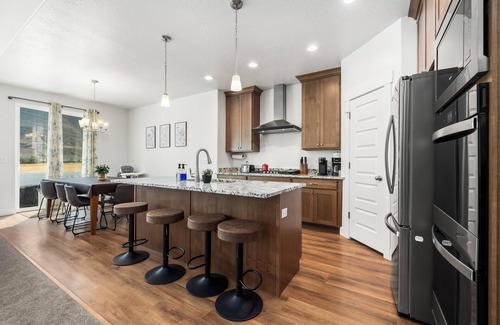 Brand‐new (Dec. 2024) home with modern furnishings throughout at the mouth of Spanish Fork Canyon. This house features 6 bedrooms, 3 bathrooms, a full chef's kitchens with a gas range and a double oven, walk-in pantry, large dining table, family room, living room, 6 tvs w/ streaming apps, fast fiber internet and and a laundry room with detergent is provided for your convenience. Plenty of parking and minutes from Hwy 6 & I-15, plus lots of shopping and restaurants nearby. Perfect for a comfy getaway, family gatherings, and housing when coming to town for a sporting event.