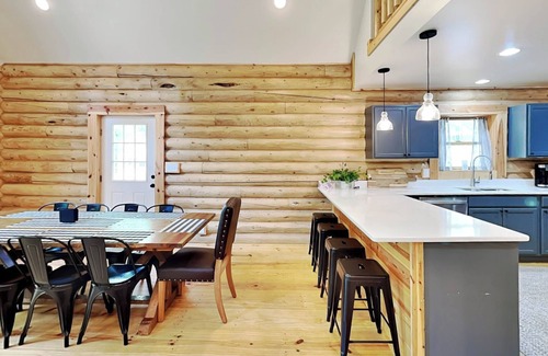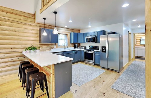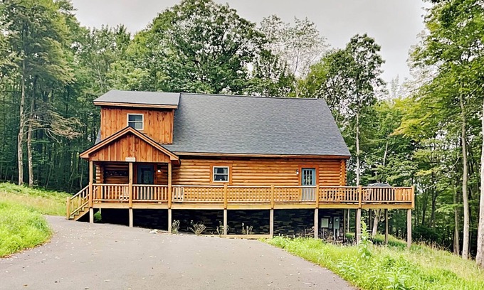 Brand new, this stunning log home is in the popular North Camp Community. The convenient location is just a five-minute drive to ski slope access and white-water rafting. You're also close to your lake access area for swimming and fishing along with restaurants, boat rentals, mini golf, and more. The picturesque surroundings can be enjoyed from the outdoor living space that includes a partially covered deck with scenic views. You will love spending time together at the built-in fire pit. You can make s'mores and follow that with a dip in the bubbling hot tub. Bright and airy, the spacious interior has an open concept that is ideal for get-togethers. The great room will be a popular gathering spot where you can enjoy the warm glow of the gas fireplace while you watch TV. Offering plenty of room for creative cooking, the kitchen is well-stocked with all the essentials. Share wonderful family dinners at the table with seating for ten. There are four stools at the breakfast bar too. Sweet dreams await in the main level bedroom that is furnished with a queen bed and a TV. Hardwood floors and exposed beams make this a warm and inviting place to rest your head. Upstairs, the loft has a foosball table to keep you entertained. There are two bedrooms and a full bath on this level as well. Decorated in soothing gray tones, the first bedroom has a queen bed along with a desk for those who need a laptop friendly workspace. The second bedroom is perfect for the kids with two bunk beds. You can easily reach Deep Creek Lake activities, restaurants, shops, and marinas by taking a short drive. During the summer, rent a boat for the day to take your crew for a cruise. When the snow starts to fall, head to Wisp Resort for skiing and snow tubing. Thrill seekers can check out the Adventure Sports Center's man-made river where experienced guides lead exciting white-water rafting trips. You're also not far from historic downtown Oakland. Stroll quiet streets lined with unique eateries, shops, and museums. No visit to Deep Creek Lake is complete without experiencing at least one of our state parks. Miles of hiking trails, sandy beaches for swimming, canoe rentals, cross country skiing and fishing are just a few ways to enjoy our public lands. For a true mountain getaway that you'll always remember, make your reservation at Almost Eden!