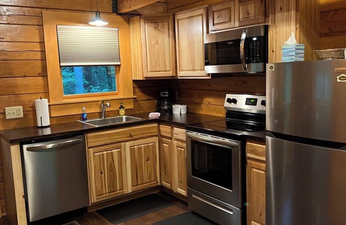 The cabin features a beautiful river rock shower, king size bed, a gas log fireplace, Smart TV with Direct TV streaming, Wi-Fi, a spacious covered front porch, deck with hot tub and gas grill. The cabin is furnished with central heating and cooling.