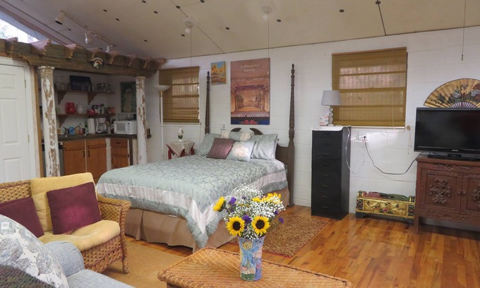 Además, debe saber que "Aloft" es una unidad abierta y ventilada con mucha luz natural. Tiene una entrada privada a través de nuestro garaje. Es posible que escuche que la puerta del garaje se abre y cierra a las 6:30 más o menos en la mañana durante los días de lunes a viernes (también algunos días de fin de semana ocasionales) ya que es el momento en que vamos a trabajar. Eso no ha molestado a la mayoría de nuestros huéspedes, pero no queremos que sea una sorpresa. De lo contrario, la unidad es muy silenciosa. Las instalaciones de cocina son limitadas. Las instalaciones de cocina son un horno tostador, una placa de dos fuegos y un microondas. El refrigerador es del tamaño de un hotel.