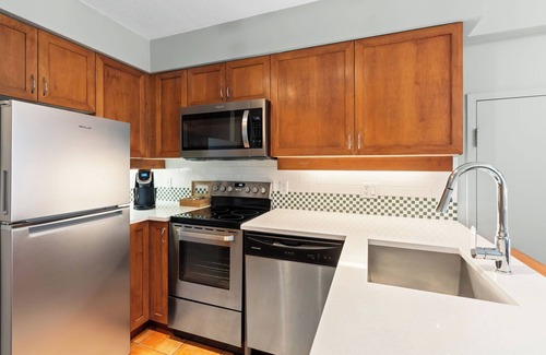 Prepare delightful meals with ease in our well-appointed kitchen, complete with sleek granite countertops, a full-size refrigerator, a convenient dishwasher, a stovetop, and a microwave. A spacious dining area is also at your disposal, making dining a convenient and enjoyable option for your stay.