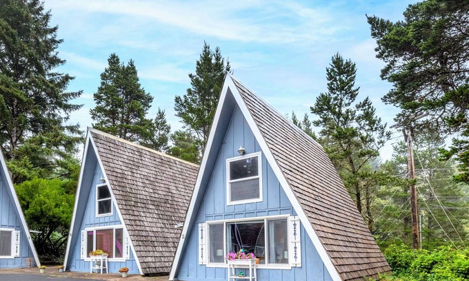 You’ll be just steps from gorgeous Beverly Beach when you stay at this charming, dog-friendly one-bedroom Otter Rock cottage. Part of the idyllic Alpine Chalets community, this cozy A-frame offers ocean views, WiFi, a shared outdoor firepit, and direct beach access.