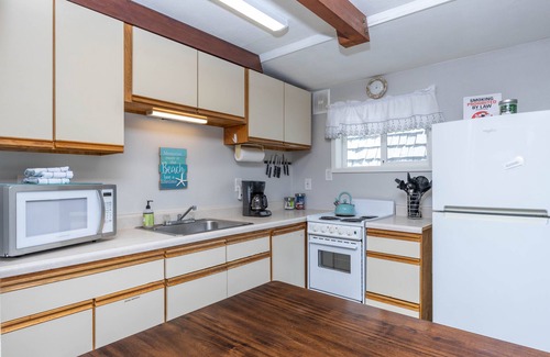 The big window offers a front-row seat to the ever-changing moods of the mighty Pacific—whether it's dramatic coastal clouds rolling through or a brief spell of passing weather. It's the perfect spot to get cozy with a good book or hot drink while nature puts on a show outside. And with WiFi available, you can still check in on emails or share your coastal retreat with friends and family online. A dining room table provides a spot to gather at mealtimes, and a full kitchen is well-stocked and ready to go for your breakfast, lunch, and dinner preparations. All major appliances are present and accounted for (minus a dishwasher). There's even a coffee grinder for freshly ground beans in the morning. And on nights you don't feel like cooking or washing dishes, Mo’s West is just a few blocks away for bowls of world-famous clam chowder.