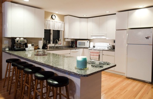 This renovated 5 bedroom vacation home has a large open common space, spacious deck with a hot tub and a large patio with a stone fire pit. The home is conveniently located six miles from both Hunter and Windham Mountains. Ground floor has two bedrooms (1 queen,1 full and 1 twin size bed and 1 queen and twin bunk beds) with shared bathroom, laundry room. Main floor consists of living room, 1 bedroom (1 king size bed with 48' HDTV), 1 bedroom ( 1 queen, 1 full and 1 twin size beds), 1 bathroom, fully equipped kitchen with an island that can sit up up to 8 people and a dining room that seats 8-10 people. The great room has hardwood floors, floor to ceiling windows with sliding doors , wrap-around sectional, a fireplace with gas burning logs, cathedral ceilings, 55' HDTV, DVD, sound system. Third floor has a loft with 32' HDTV and another large bedroom (1 king, 1 full and 1 twin bed) with private bathroom, as well as dual fireplace. This is an ideal home for entertaining.