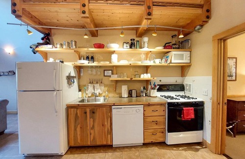 The Alpine View A and B units are a mirror image of each other. Each side has an open plan living area, with high ceilings and a cast iron propane stove. The main living space includes a well-appointed galley kitchen, dining table seating 4, couch and easy chair. A murphy bed in each living room folds down to provide a queen bed. Also downstairs in each unit is one bedroom with a queen bed and ensuite full bathroom, and a second full bathroom. The back door and entryway are open to the queen bedroom. The lofts, accessed by a ship’s ladder, each have a fold out twin futon, and a bean bag.