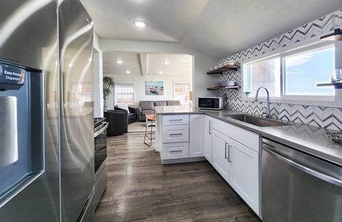 This home sleeps up to 10 with three bedrooms and three baths in the main house and another bed and bath in the studio next to the house. In the main house, there are two bedrooms upstairs, one with a Queen bed and one with a Full bed with peeks of the bay! They share a full bath between them. The Primary bedroom with a queen bed is down a few steps on the main floor. It has an ensuite bath and a washer/dryer tucked away in a closet. This bedroom has its own television and sofa to relax on. Another full bath is also available on the main floor. There is a sleeper sofa available in the living room for that little extra sleeping space! Next door is where you can cozy up in another queen bed, slip the window open, and fall asleep to the rhythm of the waves. A second kitchen features great prep space, a mini fridge, glass cook top, farm sink, and all that you will need to whip up and enjoy a late night snack! The bathroom with barn door has a spa-like tiled shower for you to enjoy. The studio has its own deck and its very own hot tub to kick back and relax in!