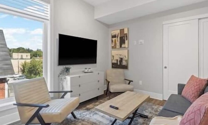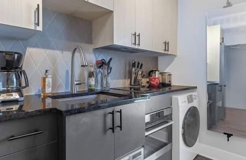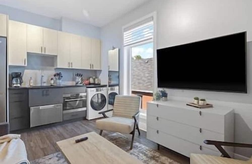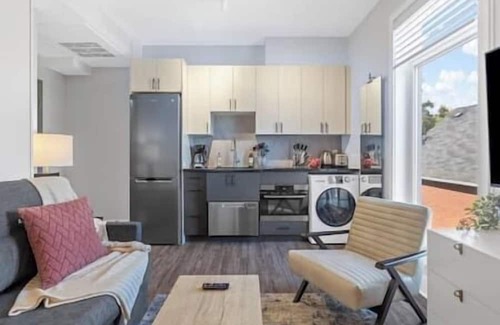 Experience modern living in this chic, centrally located studio. This well-appointed space features a full kitchen, a double-size Murphy bed that maximizes space, a TV, washer/dryer, and more!