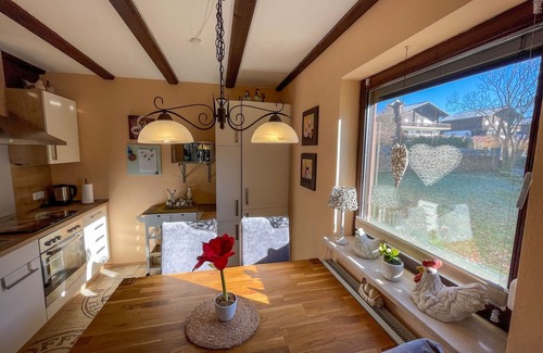 3-room apartment 75 m2, on the ground floor. Comfortable furnishings: living room with satellite TV (flat screen), hi-fi system. Exit to the garden, to the terrace. 1 room with 1 double bed (180 cm, length 200 cm). 1 room with 2 beds (90 cm, length 200 cm). Open kitchen (oven, dishwasher, 4 ceramic glass hob hotplates, toaster, kettle, microwave, electric coffee machine) with dining table. Shower/WC. Gas heating. Large terrace partly roofed, garden 350 m2. Terrace furniture, barbecue (portable), sitting area. Beautiful view of the mountains. Facilities: washing machine, iron, hair dryer. Internet (WiFi, free). Parking (1 car). Please note: non-smokers only. Maximum 2 pets/ dogs allowed. Private entrance, smoke alarm.