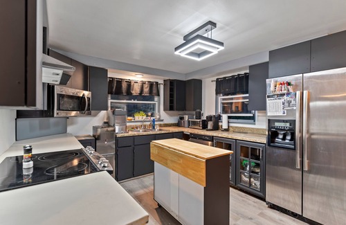 The fully equipped kitchen boasts modern appliances, including a refrigerator, stove, oven, microwave, and dishwasher. Ample cookware, utensils, and dishware are provided, making meal preparation a breeze. Adjacent to the kitchen, the dining area offers seating for your entire group to enjoy shared meals.