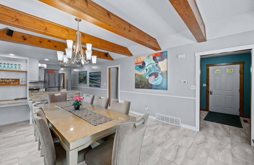 Enjoy 5 acres, a pond, a spacious 4600 square foot home AND A beautiful PARTY BARN (heated and air-conditioned) on property. Graceland also boasts an enormous kids play tower, fire pit, tetherball, a hammock, bocce ball, 2 giant Jengas, giant yard Yatzy, board games, a field for softball or whatever you want, Sonos speakers, 2 living rooms (one for kids), an office area with desk, printer, and monitor, and a large granite chef's kitchen with everything you may need for preparing/ serving/ entertaining/ hosting large groups including a commercial ice maker (we are NOT messing around!). Not to mention the 30-foot x 45-foot party barn with a video game arcade (Golden Tee, Big Buck Hunter Safari, Silver Strike), pool table, ping pong, a bar, refrigerator, microwave, 85” tv, Sonos sound system, etc… It's amazing and just had a complete renovation complete with 13 foot granite, bar cabinets and seating.