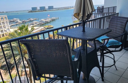 Features incredible bay and pool views. This unit is fully furnished and beautifully decorated. Each bedroom has its own bath. Master suite features jetted tub, double vanity, granite counters, separate shower, and walk-in closet. Spacious kitchen, dining, and living area with wet bar, wine cooler, and ice maker.