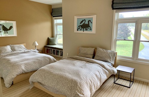 We have a large 4 bedroom, 4 bathroom modern country house in Catskill, New York. The drive typically takes 2.5 hours from Brooklyn. The house is a 15 minute drive to Hudson NY which is filled with restaurants and beautiful stores, art galleries, yoga studios and boutiques. 12 minutes to the Amtrak station in Hudson (train ride is exactly 2 hours from NYC). We are also 35 minutes from Hunter Mountain and Windham Ski areas and excellent hiking areas. Near Olana and Thomas Cole House. Our house is down a long driveway, not visible from the road and sits on 26 acres. It is on top of a big, hilly meadow overlooking a forever-wild forest/bird sanctuary. Excellent sledding right out the backdoor! Feeling of country seclusion and privacy but extremely convenient as it's only ½ mile from grocery stores, a diner, a bowling alley, Walgreens & CVS, an urgent care, a wine store, a coffee shop, a first run movie theater, a few cute stores, a good pizza place and Beerworld!