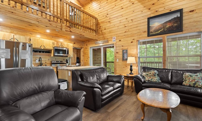 This enchanting 2 story cabin comes with 4- BR, two on each floor. Each with its own private full bathroom with tiled shower (no tubs)! Each BR has a king size bed. Very rare to find cabins with their own private bathroom and with a king bed! Additionally, two main floor bedrooms feature flat screen smart TV's with fiber optic cable TV.