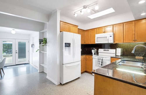 Each of the bedrooms has its own bathroom for plenty of privacy! There is even an outdoor half bath to use when spending time by the pool. The first bedroom is normally set up as a king bed, but can be set up as two twin beds upon request. All the rooms have been outfitted with extremely comfortable beds and high quality linens. Each bedroom has large closet space. The main living space is open & so charming, with leather couches, mid century modern furniture, & a beautiful and unique hanging fireplace. There is also a sleeper sofa in the sunroom if you need additional sleeping space and an extra queen air mattress is available as well. There is a 2 car garage with 2 kayaks, pool toys & beach toys for your enjoyment. We are kid friendly with a high chair, pack n play with a mattress & sheets, baby pool float, slip n slide, and more! If you're looking for something specific, just let me know and we can make sure it is there.