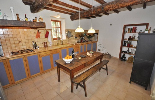 Inside, the stone floors and walls, a fireplace and wooden beams on the ceilings create the perfect holiday feeling. One of the two independent entrances below the small covered terrace leads to a separate studio with a double bed on the mezzanine floor, a second kitchen and a shower room.