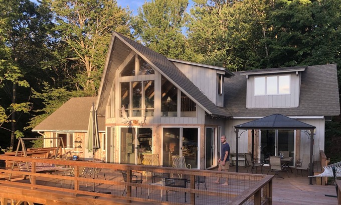 The house has four bedrooms and a sleeping loft. It can sleep 10 people. Our house is an upgraded summer cottage with lots of vintage charm and pleanty of space. We have a wide variety of kitchen appliances but no marble counter tops in the kitchen or granite in the bathrooms. But the house is comfortable and spacious with lots of cubby holes. It has over 2500 sq. ft. of interior space and a 1200 sq. ft. deck. There are 3 full bathrooms and two living rooms. It sits on four acres of land and is surrounded by forest on three sides and Lake Michigan on the west side. There is a deck on the bluff which sits 50 ft. above Lake Michigan so the sunsets are breathtaking. The house sits on Lake Michigan but there is also an inland lake, Crystal Lake, at the opposite end of our road. We are three miles from Frankfort, which has lots of restaurants and a hospital, two miles from Point Bestie Lighthouse and about 40 minutes from Sleeping Bear National Park.