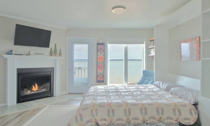 This charming condo has everything you could want in your Bayfield getaway and more! This second floor (top floor) studio condo unit features panoramic lake views, a crisp & modern interior, new gas fireplace, fully-equipped kitchen, and even a private deck overlooking the lake (perfect for dining al fresco or enjoying a sunset cocktail). There's even a sandy beach for swimming literally steps from the condo!