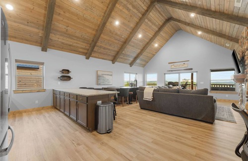 Step into this RUSTIC CABIN and be greeted by the stained wood vaulted ceilings and the extra large great room! This living space is full of LUXURY COMFORTS featuring an oversized sectional with room for your whole group, a solid wood dining table ready to seat 12, and a floor to ceiling stone FIREPLACE for cozy evenings in! The kitchen comes fully stocked with everything you would need to cook up your favorites and the extra large peninsula offers plenty of space for cooking or serving!