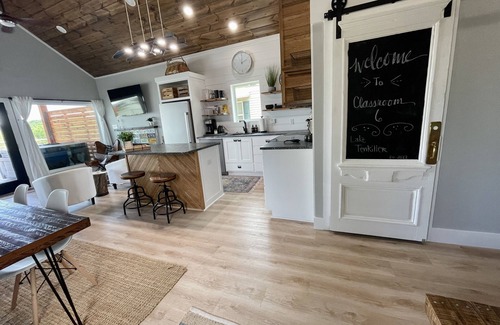 Classroom 6 - This one-of-a-kind 2bed/2bath was a former portable classroom. Most of our pieces were handcrafted to make your stay very memorable and relaxing. The hot tub is located on the top deck that has incredible views of the lake & the marina. The lower deck has a seating area along with 2 porch swings that seem to help life slow down. 36" Blackstone grill helps to make your dinner plans come together nicely.