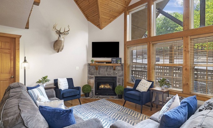 Step into a sprawling 2,300-square-foot expanse where rustic charm meets modern luxury. Hardwood floors, soaring cathedral ceilings, and expansive windows invite the surrounding scenery indoors. The lodge's heart, a fully-loaded kitchen, is your culinary playground, while the grand living area, adorned with a plush couch and massive Smart TV, beckons cozy evenings by the gas fireplace.