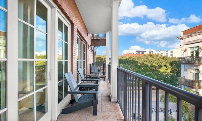 Because you're on one of the topmost floors, step outside onto your private balcony for spectacular views. Facing the courtyard, this outdoor reprieve comes complete with Adirondack chairs and two side tables. Remarkably, most of Downtown Savannah remains lively into the evening hours, which makes these seats perfect for people watching and enjoying the waterfront over the treetops. Simply step out of the French doors connecting this balcony to the living room.
