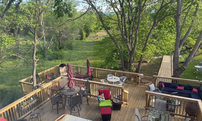 This 20th century home, nestled in the Shenandoah Mountains, is a perfect location to get away from the hustle and bustle and breathe some country air while enjoying the scenic views, sounds, sites and activities of the countryside. Everywhere you look- there’s a beautful view, but yet, you are a short walk from the biggest sites! Drive up and you’ll see the multi level, expansive deck! Complete with numerous seating areas, sunning areas, dining areas, solar umbrellas, couches, mini frig, bar, games, oversize cooler, trashcan, serving stations, benches, Hydromassage Salt water Hot Tub and outdoor TV! With this type of outdoor space, and free parking across the street- you could have a family gathering, wedding, or other event outside! Inside, you’ll find 4 bedrooms, a renovated kitchen with a side area that houses the washer/dryer, and more kitchen appliances, a screened in porch upstairs, a cozy living room downstairs and 2 full bathrooms. This house sleeps seven adults comfortably, although three-four smaller kids can fit using the additional sleeping spaces described below. Back outside, beyond the multi level deck, there is a lit walk way that takes you through the yard, to the fire pit with built in benches and cushioned Adirondack chairs for those times around the fire, making s’mores and creating memories. Your group will enjoy plenty of space to be together, or to take some time apart. Rooms/Beds: DOWNSTAIRS - 1 master bedroom with master full bath - 1 Queen bed Second full bathroom is also downstairs UPTAIRS- 3 bedrooms. Bedroom #2- 1 Double bed plus twin pullout trundle under the bed Bedroom #3- 1 Double - 2 blow up mattresses in closet Bedroom # 4- 1 Twin. With pop up bed under bed. Luray is well known for the Luray Caverns and the Singing Tower, and here you have them both within walking distance! Walk out of the door - and you are looking at the Singing Tower! Come out of the door and turn right, walk 3 minutes down the country road, and you will come across a pond where you can sit, fish, or stroll. Continue across the highway for another 3 minutes, and you will be at the entrance of the Luray Caverns, with its caves, stalagmites, stalactites and much more. Children and adults alike will enjoy the Caverns Car museum, gift shop, outdoor mountain climbing activities and Hedge Maze! Come out of the house and start walking to your left past the church, and you’ll find a great little place that serves alcohol and amazing burgers. Hop in the car, and drive 30 min to Harrisonburg, for those needing to attend James Madison University events.