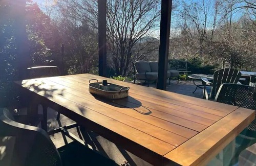 Our large living room with mountain views, a large couch, wide-screen smart tv, and wood burning fireplace. The kitchen has a gas range and all the necessities for preparing a meal at home: pots, pans, cookware, crockpot, dishes, glasses, coffee makers, etc. The dining table looks out onto a Juliet Balcony and to the rolling hills beyond. There is also access to the screened-in porch and deck that flows down to the patio. The porch gets lovely morning sun and is a great place to enjoy your morning coffee even during the winter. The Primary Bedroom is also upstairs and has 1 King Bed, an on-suite bathroom, and a walk-out to porch. The washer/dryer are also upstairs and are located off the hall next to a half-bath.
