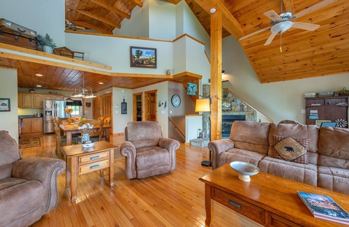 Welcome to the Swiss Mountain Lodge, your cabin in the mountains. If you’re craving quality time away with friends or family in a gorgeous natural setting, this is the place for you. This beautiful cabin is located in a pictureque setting nestled in the Blue Ridge Mountains with absolutely spectacular mountain views. Take some time get to gather around the large wood-burning fire pit on the patio area or get some R&R while taking in the amazing views from the hot tub area or the spacious decks.