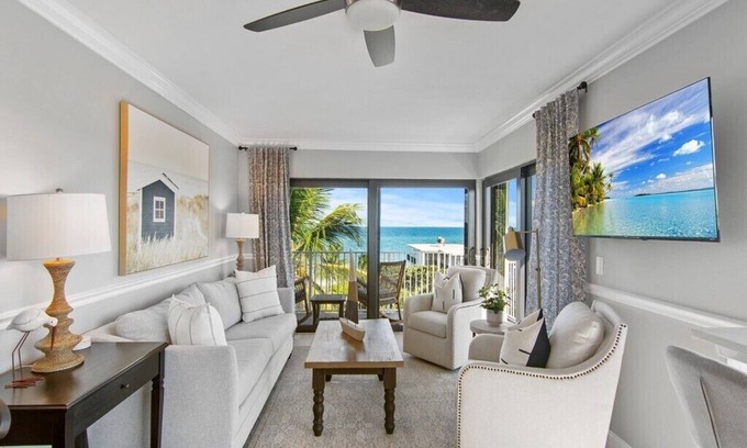 Spectacular and newly renovated condo, DIRECTLY ON THE OCEAN! It's an end unit, top floor, facing east, south and west, so there are sunrises in the morning and sunsets in the evening. Three sliding doors open onto a large patio facing the ocean. Sounds of the ocean from master bedroom and living room. Sit and rock on the quiet, peaceful patio. Completely renovated condo with brand new tile flooring throughout, complete new kitchen, all new bathrooms and new washer/dryer in unit! Smart TVs in all the rooms and high speed wifi. New King mattress and adjustable bed in master bedroom. Twin beds in guest room can be converted to a king bed if needed. Comfortable rocking chairs on the porch so you can sit outside all day. Electric grill on the patio for easy barbeques. Four beach chairs and umbrella available for the beach. Only 70 steps to the ocean!