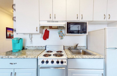 Enjoy waking up with morning coffee and expansive ocean views on the private balcony. The kitchenette includes a toaster oven, fridge, microwave, and stovetop. After a day of surfing and sandcastle building, rinse off in the outdoor shower, play pool in the game room, and unwind by streaming your favorite movies from bed while the sun sets over the waves outside your window.