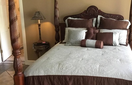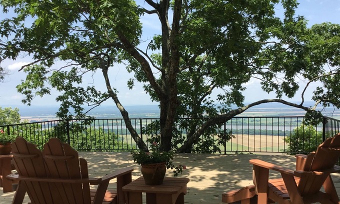 Beautiful, secluded 4 bedroom 3.5 bath (3600 sq. ft.) facing the north brow of scenic Petit Jean Mountain. Fully furnished, sleeps 14. (1 King, 1 queen downstairs, 2 queens, 4 bunks, and 2 daybeds upstairs.) Galley kitchen, laundry room, dining room, large open two story gathering room with multiple sitting areas. A 55" HD television is easily viewed from the gathering room, and the master bedroom includes a 43" HD TV. Both TV's have Satellite and DVD library. The living, dining, and master have direct access to the 2500 sq. ft. multi-level deck overlooking the river valley area and the Arkansas River. Perfect for outdoor dining and entertaining. (Gas grill available) The kitchen has a French door, bottom freezer refrigerator with icemaker. Other amenities include coffeemaker, blender, toaster, popcorn popper, microwave, under counter 40 lb. icemaker, dishwasher, and electric range. Cookware, utensils, and dishes accommodate all guests. Master bath includes dressing area, claw foot tub, and multi-head shower. Second down stairs bath has shower tub with access from hall and king bedroom. Upstairs bath with shower is accessible from all sleeping areas. Hairdryers are furnished. Downstairs powder room is located near kitchen and gathering area. Check-in is at 3pm and check-out is at 10am.