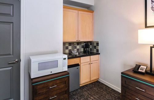 Studio Hotel - Special Needs: King bed in living area. Mini kitchen with refrigerator and microwave. No oven or stovetop. Grab bars, roll-under sink, roll-in shower. Maximum occupancy 2.