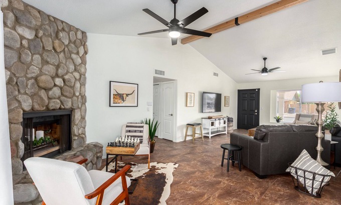 Enjoy time reading, relaxing or watching TV in the living room on the two couches and upholstered chair. There is ample room for everyone to be comfortable and to spend time together. For those that want to enjoy playing chess, checkers or cards there is a chess table with two upholstered chairs by the fireplace to challenge each other or maybe just sit back and relax. There is Roku TV so streaming Netflix, Amazon, HULU, free movies, etc is a breeze.