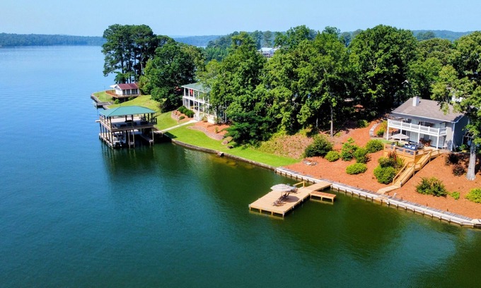 Beautifully remodeled lakefront 3 bedroom and 2.5 bathroom home. Sleeps 10 people. 40 minute all highway drive to Auburn (on Highway 280). 10 minutes from the new Alexander City Publix. Walkable to Boodock's at Bay Pine for pizza, cocktails, boat ramp, live music and boat rentals. Lovely character exudes from the antique beamed open kitchen and family room. Owned by Atlanta interior designer. Have fun with the whole family at this stylish place. Completely updated. Brand new private 18' by 32' dock and over-sized deck with large dining table and comfortable seating Morning sunrise view from the lakeside dock and beautiful sunsets from the upper porch. Internet, 70" flat screen with Sonos surround sound system. This is not your typical lake home. Power strips next to every bed for easy phone charging. Dock has swim stairs and is behind a no-wake zone.