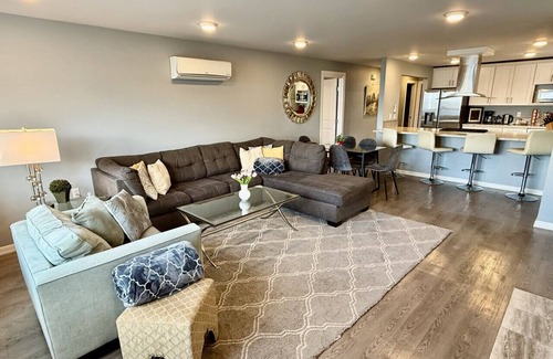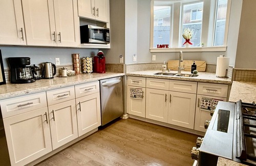 This tastefully renovated Tacoma property features high-end amenities and a modern vibe. Enjoy a bottle of wine (from the tasting room only blocks away) in front of the gas fireplace. Socialize with guests and enjoy the view while cooking in the well-appointed kitchen with stainless appliances and quartz counters. Enjoy the full en-suite bathrooms, flat screen televisions, full capacity washer and dryer, and comfortable sleeping space for six guest with a king bed in the front master, queen in the back master, and a surprisingly comfortable full-size fold-away in the spare closet!