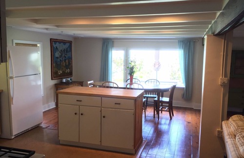 The rental features a plush queen bed in one bedroom and a deluxe queen and twin bed in the other. All linens are provided. The kitchen is fully equipped to make a fancy feast or a simple snack. Eat at the expansive dining table or snack at the cutting board topped island. The rental is comfortably furnished with an eclectic assortment of vintage furniture. Just outside the front door is a private patio with a picnic table and charcoal grill.