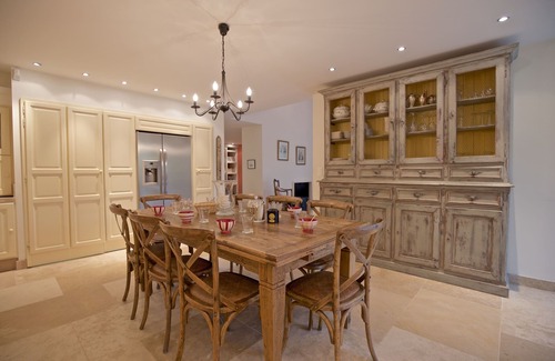 The kitchen, decorated in the Provencal fashion, is the heart of the house. Equipped with top of the line appliances, including our brand new Lacanche 140 cm piano de cuisine (2 electric ovens, 5 gas burners & 2 induction ) (to come mid July) a large pantry, and all the necessary cookware, it is truly fit for the gourmet cook. Our American guests will feel at ease thanks to the imported measurement tools, English cookbooks, washer/dryer and ice-water dispenser fridge... The laundry and storage room is right behind the kitchen, fully equipped as well.