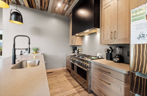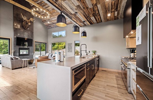 ★Spacious kitchen featuring high-end appliances, including a 48” gas range, 36” refrigerator, dishwasher, and a drawer microwave, perfect for preparing meals while enjoying mountain views.