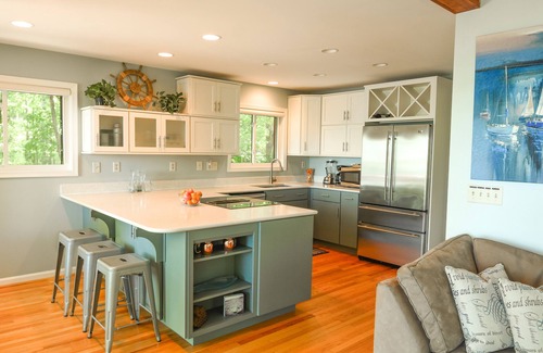 This home has a fully, updated and equipped kitchen for all your cooking and baking needs with granite counters and stainless steel appliances. The main level living room/kitchen area are great for relaxing and entertaining with everything you need, all while admiring views of the beautiful lake.
