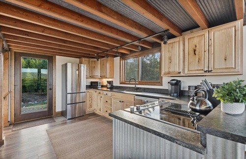 A peaceful, private retreat awaits in the charming Guest House, featuring a queen sleeper sofa, TV, fully equipped kitchen, 2-seater table, and a guest bedroom with a queen bed. Outside is a large deck with majestic mountain views and plenty of room for peaceful morning yoga—or stretch out a blanket at night and search for constellations.