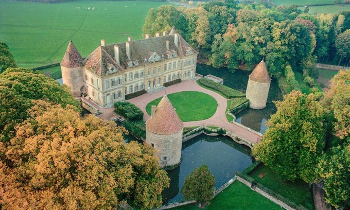 Burgundian chateau surrounded by four medieval towers, broad moats and by extensive and well-maintained gardens.