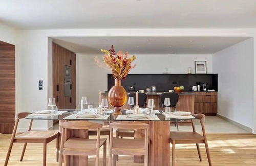 Relax in the elegant living room, where you can unwind on the plush sofa, armchairs, and coffee table after a day of exploring Paris. A large flat-screen TV and high-speed WiFi are available for your entertainment. The dining room can accommodate up to 8 guests, making it perfect for dinner parties or family meals. The fully equipped kitchen comes with top-of-the-line appliances, including an induction hob, oven, microwave, Nespresso machine, and toaster, providing everything you need for a true culinary experience. The laundry room is conveniently equipped with a washing machine, dryer, vacuum cleaner, and ironing equipment, making it easy to freshen up after a day of sightseeing.