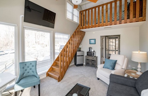 UPSTAIRS SUITES: Top floor has 3 master suites, each with a main level living room with full bath, queen sofa bed, large screen TV, DVD player, seating area, mini-frig, microwave, Keurig coffee maker, iron, hair dryer, etc. and a separate loft bedroom. Most of the beds, as well as all of the sofa beds, have 3-inch hypo-allergenic feather pillow toppers and lots of pillows for you to sink into.